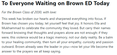 这个申请季,布朗大学原定于当地时间的12月15日公布早申录取结果,但由于校园枪击案件推迟了两天,在12月17日终于公布,不管对于在校生还是申请者,都是比较特殊的一年。