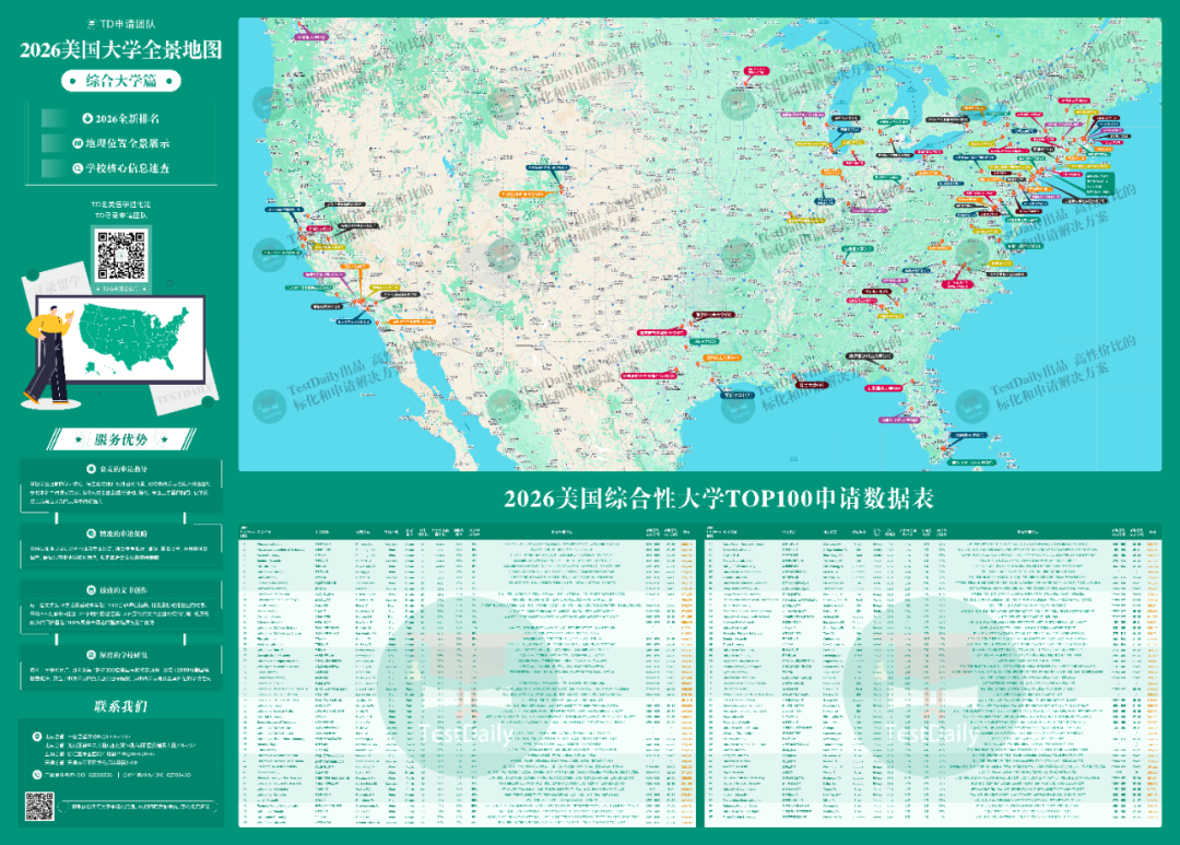 我们精心打造了一份极具实用价值的美国大学地图,采用高清格式与中文标注,专为美本申请者设计。地图全面覆盖美国综合性大学前100名及文理学院前70名,整合了申请人最关心的核心数据,包括地理位置、最新录取率、SAT/ACT中位数、热门专业等。所有内容基于2026年最新版U.S. News排名进行权威更新,帮助用户快速掌握最新升学趋势。这份地图直观清晰、方便打印张贴,不仅是选校比对的高效工具,更是留学规划过程中不可或缺的参考资料,强烈推荐给正在准备申请的学生和家长!